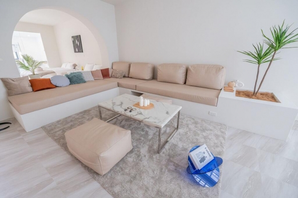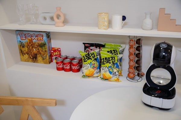 客廳超級寬敞,無隔間設計使得整體更加寬闊,純白色調為基底,溫馨簡約很舒服,還有一個超大L型沙發椅,怎麼躺怎麼坐都很舒適!吧檯區還有提供冰箱,有免費的礦泉水、可樂、膠囊咖啡與餅乾可以享用~