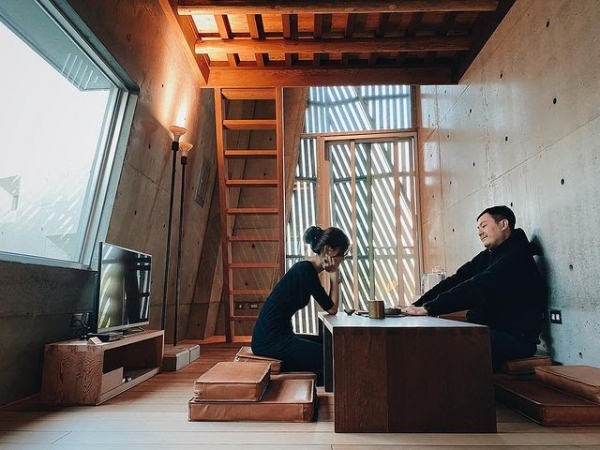 住宿的「金毛屋」是穿透式的挑高樓中樓,內有起居室、閱讀室、茶室等公共空間,總共有5間房,每一間都有不同的設計感,不管是旋轉樓梯、茶几、浴室、臥房都能看到設計者的用心,好好欣賞建築的每個細節!
