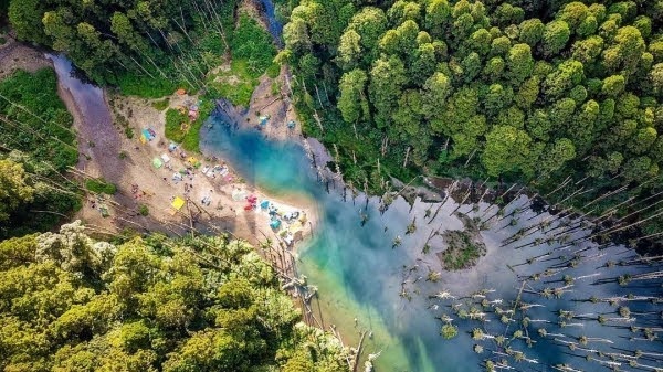 阿里山山區的一座堰塞湖秘境,因921大地震後河道受阻形成,平均深度為7公尺,最深達16公尺,其杉林因長期泡水枯死,群體的死亡姿態在水中倒映出凋亡之美,因此有了水漾森林仙境般之美名!