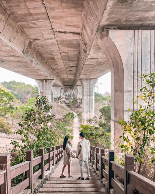 台中IG打卡新地標!隱身於國道三號下方,全長約2公里,其坡度相當平緩好走,一旁也設置了自行車道可以騎車,延綿步道的景觀拍過去宛如萬里長城一般好壯觀,絕對是親子出遊、情侶約會最新好去處!