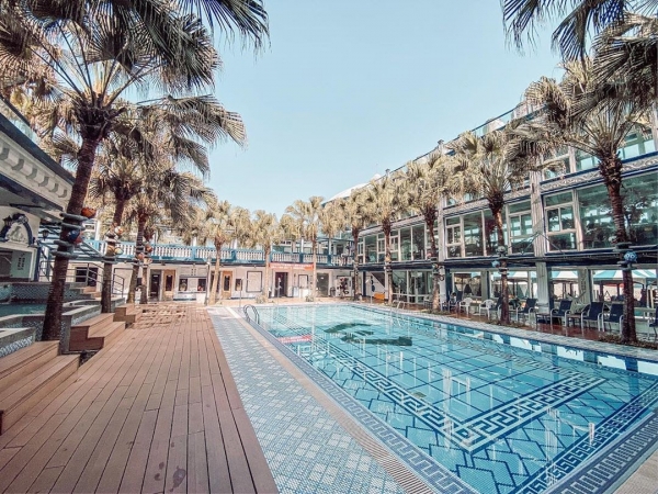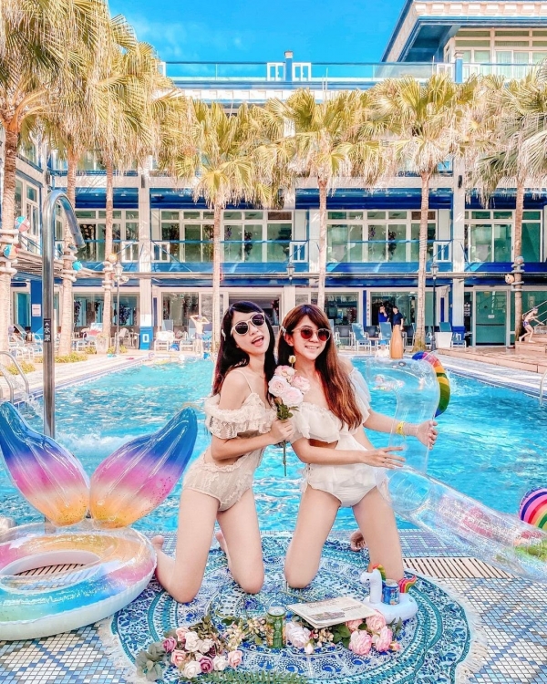 除了沙灘和大海,園區裡還有一大海島風泳池,周圍種植滿滿的椰子樹,就好像真的秒飛峇里島一樣,飯店時常辦泳池派對,讓旅客能夠留下深刻又難忘的回憶!
