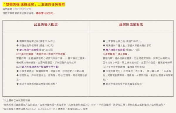 位於台北中山區的「台北美福大飯店」與淡水河畔的「蘊泉庄溫泉飯店」攜手合作,即日起至6/30止推出「雙饗美福 逸遊蘊泉」2泊4食住房優惠專案,等於第二晚0元就能入住,不須連續入住也行,假日不加價,還能爽吃牛排、爽泡香檳色黃金美人湯、玩電動賽車場,盡情享受美好假期!