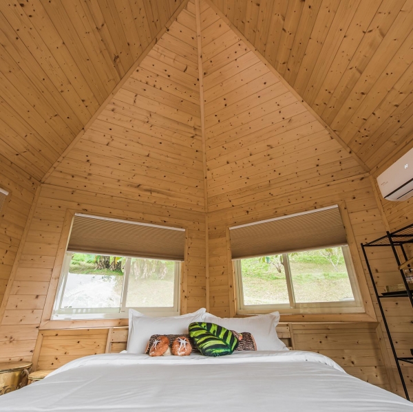 房間設計簡約舒適,強調使用與五星級飯店同樣的床墊,搭配森林系的植栽圖案抱枕、動物花紋地毯,再以溫暖的燈串、小旗幟點綴,可以完全放鬆在這大自然中!