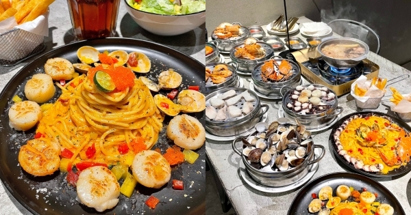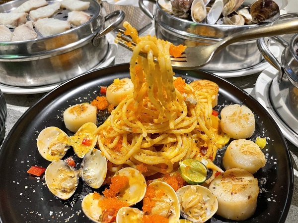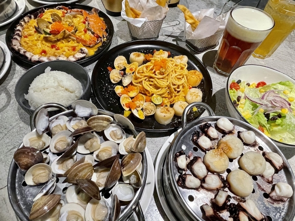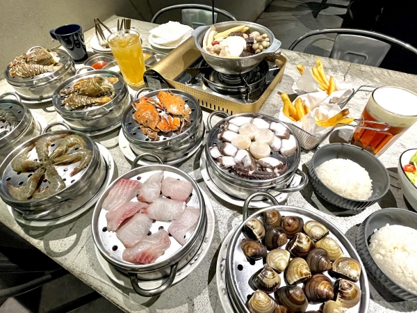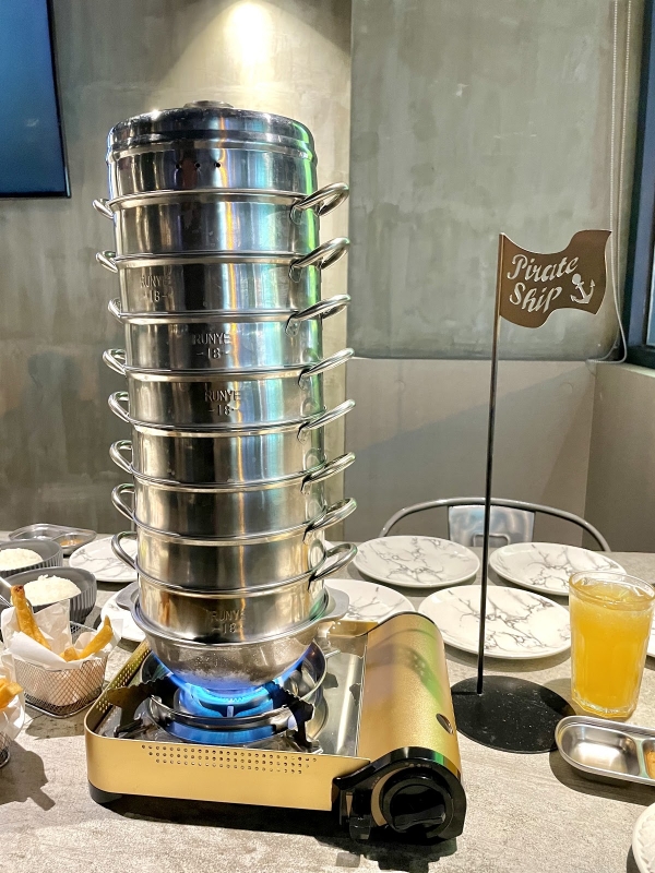 再來是超浮誇的蒸氣火鍋海鮮塔,這個高度真的太驚人了啦~一層一層的美味往上堆疊,有蛤蠣、魚片、草蝦、螃蟹、龍蝦...