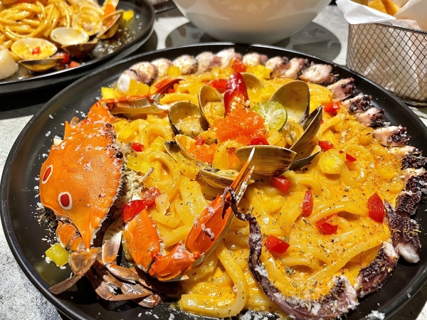 不是我在說!!看看這一整隻的螃蟹趴在麵上!會不會太誇張了啦~這一盤我選的是Q麵,不像一般義大利麵的口感,旁邊還圍了一整圈的深海章魚腳,超好吃!