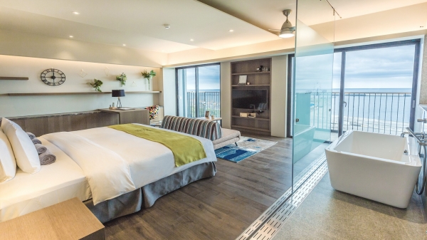 擁有12坪超大寢居空間的【豪華海景套房】,有充滿著海洋與森林氛圍的空間與寬敞客廳、臥室與一套半的衛浴空間,房內準備專屬全套義大利艾格妮知名有機品牌盥洗用品。