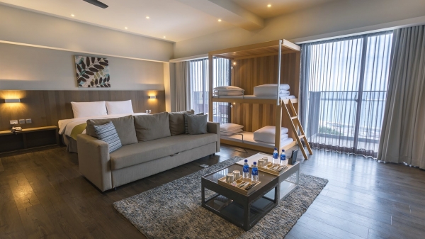 擁有12坪超大寢居空間的【豪華海景家庭親子套房】,充滿著海洋與森林氛圍的空間,優雅內蘊的低調奢華設計,搭配大片落地窗景,碧海藍天躍然於前,彷彿置身大自然之中,適合闔家或閨密好友一同來享受無壓假期。