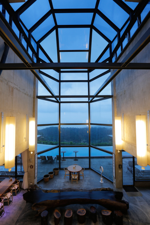當您走進我們的大門,迎賓池裡的台灣水牛石雕親切的向您問候,挑高的鋼構通透大廳裡,豪邁的毛柿原木長桌絕對是視覺焦點,清水模與粉光牆面簡約清爽,原本山上的老樹,也成了創意家俱的木料!