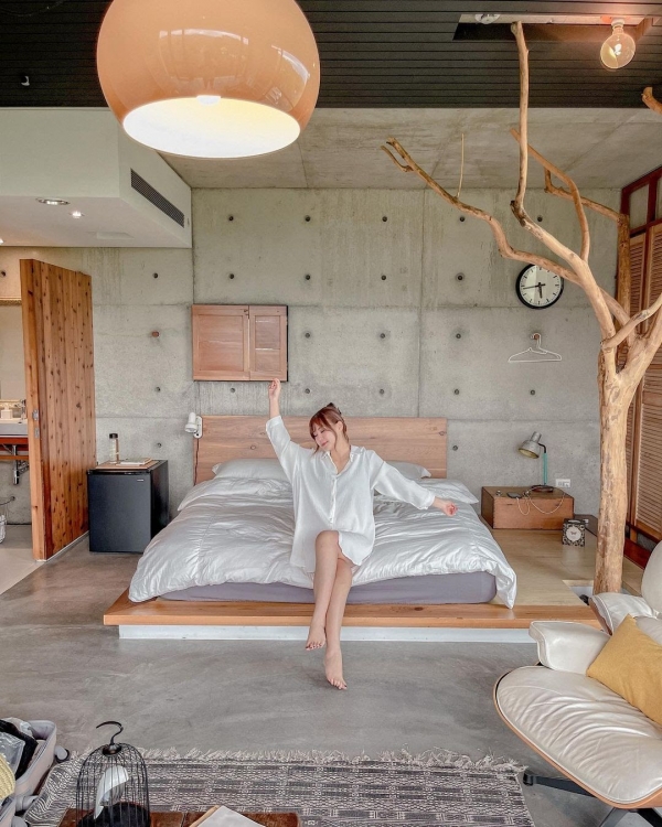 這間房型為【我很宅,爬三樓】,以灰色清水模的基底,一旁還有樹木裝飾,整體裝潢溫柔舒適,也非常有質感,更是IG上的熱門打卡房型之一!