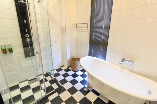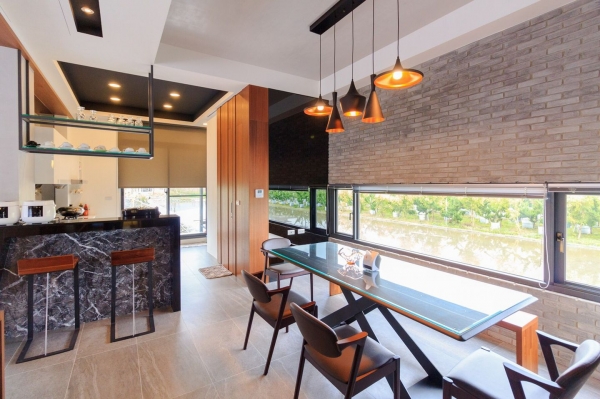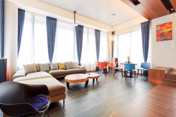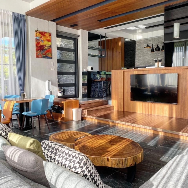建築周圍有大片的落地窗,採光非常明亮,陽光可恣意的灑進室內,木質色調的裝潢很溫馨舒適,大廳有一L型沙發和餐桌區,還有非常厲害的影廳設備,如果一家人來包棟度假,可以看電影、唱KTV超享受!