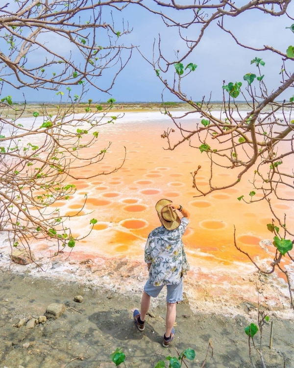 想看彩色鹽灘景觀免出國,來七股就能目睹這片奇景啦!在頂山的廢棄鹽灘地因海水引入鹽田,久旱不下雨,蓄積的海水長期受陽光照射蒸發所形成,成了高濃度鹵元素水,有的還積聚成鹽!