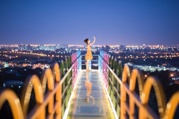 宜蘭首座彩虹天空步道就座落在員山鄉,像是通往天際的透明步道可以360度飽覽蘭陽平原美景,遠眺海上的龜山島全貌,白天夜晚都有不同的風貌景致,透明的強化玻璃增加了步道穿透力與美感,兩側彩虹色調與愛心的氣球的妝點,讓步道增添更多浪漫氣息。