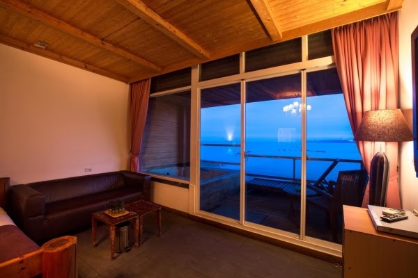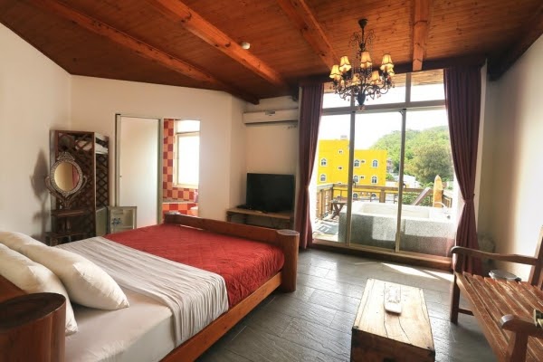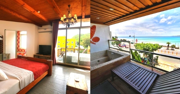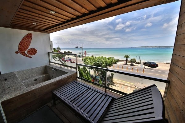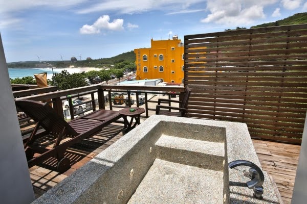 旅店充分利用大片的無敵海景,每一間面海四人房都設有半露天戶外陽台,陽台上都附有泡澡浴池,但因為是半露天的陽台,必須穿泳衣或浴巾使用(房間內有衛浴設備可供洗澡,不用擔心洗澡的問題!)