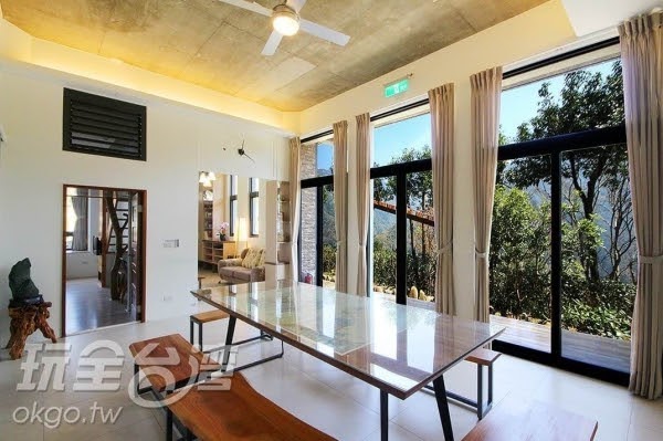 挑高的空間設計,搭配純白牆面及木質感家具,更吸睛的是滿滿的大面積景觀落地窗,可以零死角遠眺無敵山景!