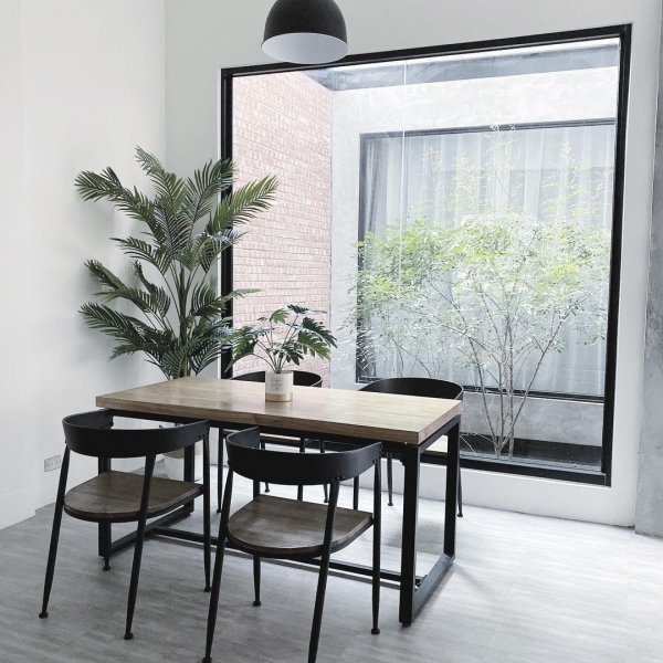 房間的透明落地窗,透進自然陽光很唯美!拉上窗簾也可以防止紫外線不用擔心,天井的設計可以從房間直接看到樹!