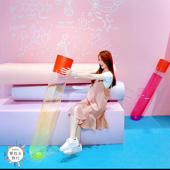 與大型水果們拍完照後,還有專屬少女的粉嫩系實驗室在後頭等著你!巨大的粉紅書籍裡,紀載各種少女心化學公式,試驗室中的試管調配的是夢幻的粉色系,真的是怎麼拍怎麼美!