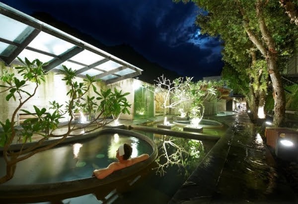 除了室內泡湯外,還能到戶外感受大自然沐浴!鏡面溢水泳池倒映著燈光及大自然山水景觀,岩石、樹木、水瀑、燈光,豐富了湯區的視線,甚至還貼心地設置泡腳池,讓不便泡湯或等待聊天的旅客使用,有如在溪中戲水泡湯,享受自然山水美景!