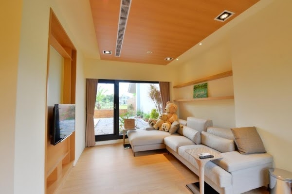 房內一走進去眼前即是大客廳,以優雅的木頭風格為設計,在L型沙發上也有擺設著超可愛的熊熊,如果是多人旅行也不用擔心空間太擠沒位子坐,窗外看出去是綠意盎然的小庭院!