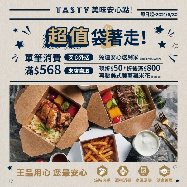 -來店自取:現折$50元。折後滿$800,再贈美式脆薯雞米花。