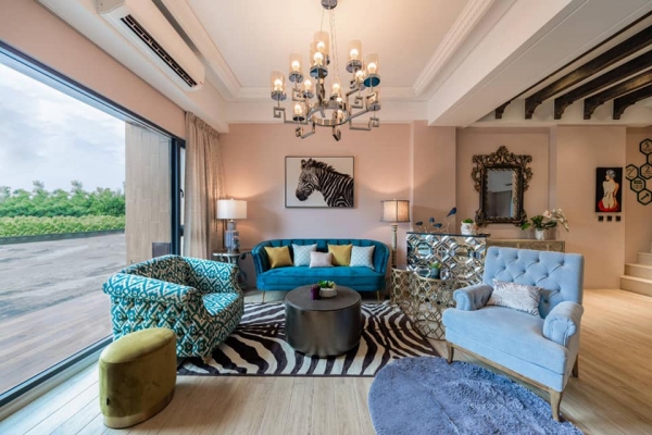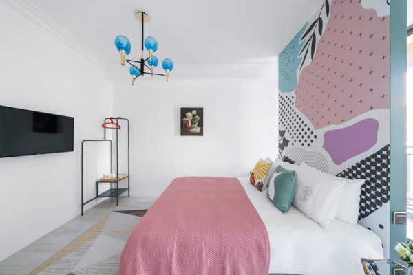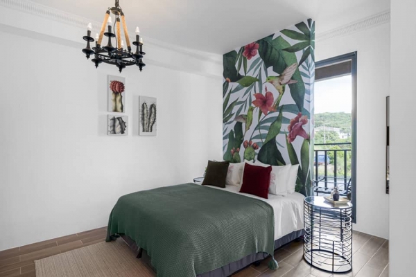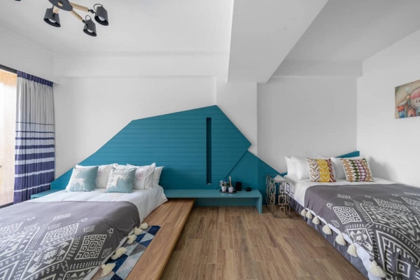 色彩繽紛的雙人房型,利用色塊和植栽圖案拼接而成,讓純白極簡的房間,增添了渡假感,獨享私人陽台,可以一覽戶外美景!