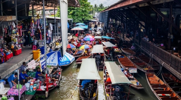 這算是一個泰國奇景,各賣家在船上努力叫賣,看見遊客就會第一時間靠在岸邊,最常見的就是賣些當地盛產水果、小吃。