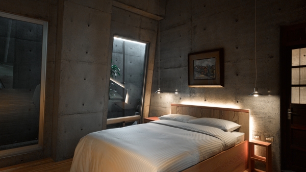 民宿由「金毛屋」、「透明大屋」、「時空小屋」及「毛院子」四個不同特色的區域所組成,前三者為住宿,最後者為用餐的地方。這些空間都不算大,用植栽和木質色系的清水模搭配,有些角落還帶點日式侘寂的美學,隨手拍都像明信片中會出現的場景!