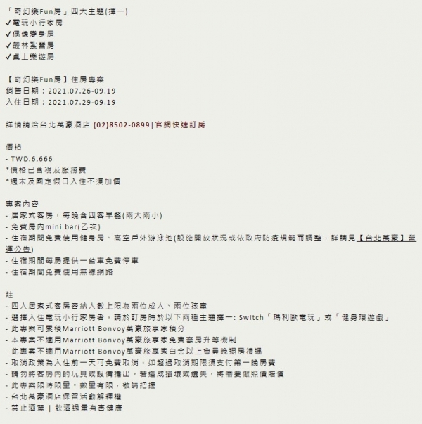 台北萬豪酒店推出了盛夏限定「奇幻樂Fun房」住房專案,精心打造四大不同主題客房,讓你與家中寶貝入住空間寬敞的四人居家式客房,盡情享受超有fu的房內主題設施,再送早餐四客(兩大兩小)以及房內免費mini bar一次(含清涼汽水及啤酒各四瓶,以及香脆零食兩包)!即刻預訂,為家人寫下無限美好的暑期回憶!
