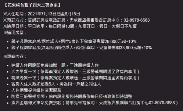 堪稱「台版迪士尼」、由天成飯店集團所打造的瑞穂天合國際觀光酒店,以南歐莊園風格為主題打造,也是國內首座結合星級觀光飯店、格蘭別墅、親子別墅、溫泉黃金湯/金色水樂園。最新推出「花東縱谷親子四天三夜」住房專案,親子溜滑梯房四天三夜享一晚免費, 讓孩子在房內安心放電享受親子好時光!