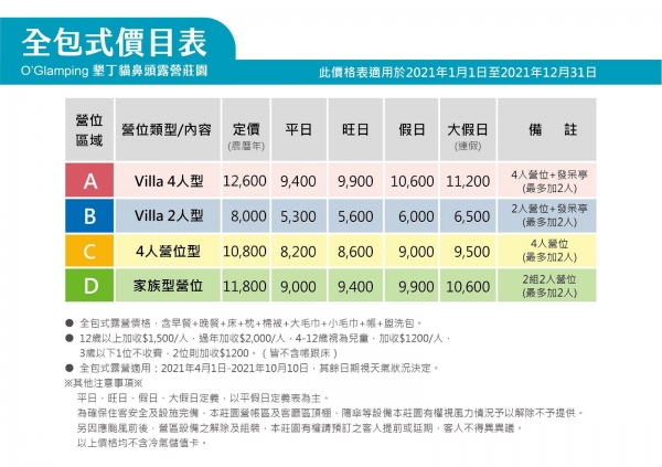 帳位平台尺寸 600x320cm,基本人數為4人,如需加人需額外付費,F營位為提供客人自帶裝備露營,僅提供帳位基本水電及公共盥洗室、公共廚房使用。不含帳篷、及提供相關露營用品。
