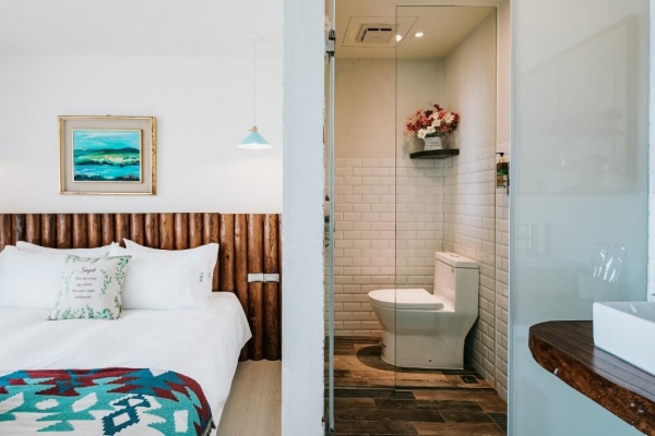 附有陽台的海景雙人房,可以看出在簡約又低調的設計中,發現民宿主人的巧思,搭配著異國風情的圖騰樣式,衛浴空間雖然不大,卻也應有盡有!
