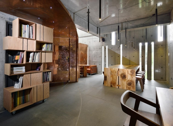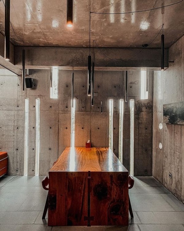 推開紅銅大門而入,接待大廳清水模灰階色牆面的自然紋理,搭配天然原生木家具,極簡時尚風格,沒有過多的修飾,整體場域寬敞自在,不易受他人打擾。