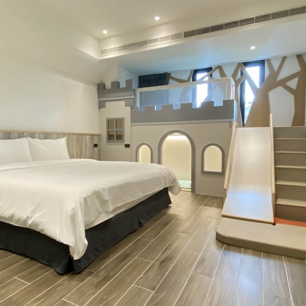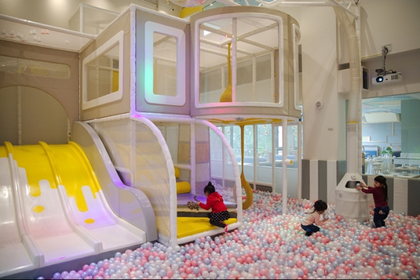 走上二樓,眼前是會讓小孩流連忘返的「時空派對」親子遊樂園,近百坪的室內遊戲空間設有沙坑區、家家酒區、閱讀區、幼兒遊戲區等主題區域,更吸睛的是還有大型溜滑梯的挑高球池區,牆上的互動螢幕絕對會讓小孩們愛不釋手,以上空間皆免費招待用餐及住宿消費者暢玩!