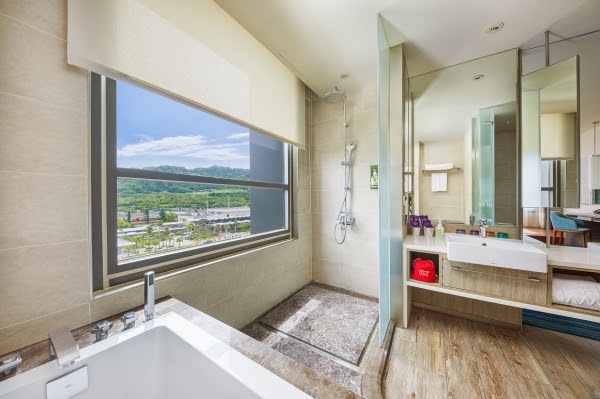 飯店為了迎接不同類型的旅客,提供110間客房、4種房型可以選擇,有適合2人入住的「探索客房」、3-4人入住則推薦「發現三人房」,還有適合家族親子旅遊的「逗陣客房」,也能加價600元在房內增設粉紅小帳篷,滿足小朋友們對露營的渴望。而「趣淘套房」則擁有130度環景角度、客廳及浴缸,是飯店內最頂級的房型設計!