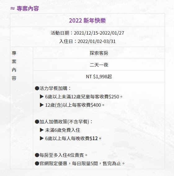 最新更推出了「2022新年快樂」限量專案,即日起至2022/1/27止,2人入住探索客房1998元、4人入住2022元,另外4人同行並持國旅券結帳再享超殺優惠價,每人只要255元就能爽住探索客房,實在太划算啦!