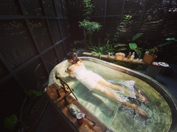 戶外還延伸一處泡湯空間,讓你在手作磨石子的原始泡湯池內,享受礁溪獨有的碳酸泉清澈溫泉!