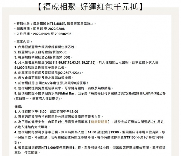 飯店好康報報!這家飯店推出限定優惠方案,只要「生肖屬虎」就可爽爽入住,還能免費拿1000元、價值1580元的好禮等,再吃米其林餐廳年菜有夠讚!