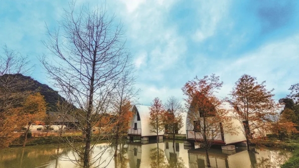 落羽松秘境水塘上的野奢Villa蓬屋,設有私人泡澡浴缸與獨立客廳、後方休閒發呆露台,放空享受寧靜水塘邊潺潺流入的山泉水聲及難得的光影演繹,獨享優境隱世的美好山居浪漫時光!