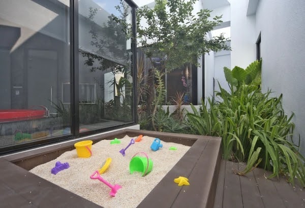小孩最愛的玩沙池,玩髒了就能直接進房間洗澡啦!