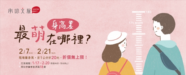 承億文旅集團旗下七家,有淡水吹風、台中鳥日子、花蓮山知道、桃城茶樣子、潭日月、墾丁雅客小半島及嘉義商旅,即日起至2/21推出「最萌身高差」住房專案,只要雙人身高每差1公分,就能當場折20元,以此類推,差10公分折200元、差20公分折400元,身高差越多越划算!