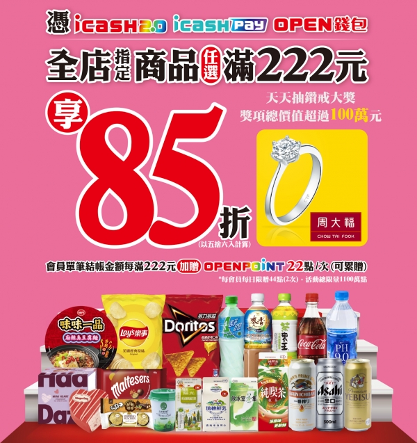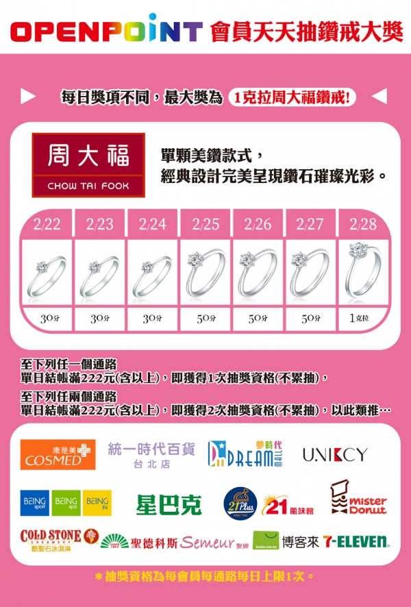 金額滿222元(含以上),天天再抽周大福鑽戒