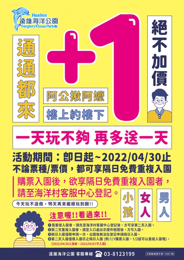 再搭配+1優惠方案,享隔天繼續免費入園再玩一天!