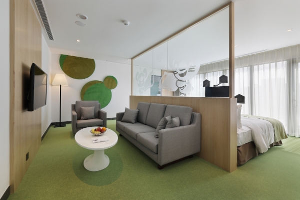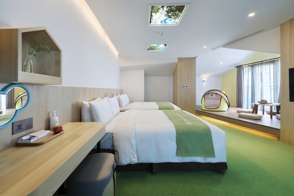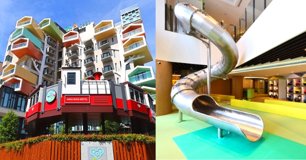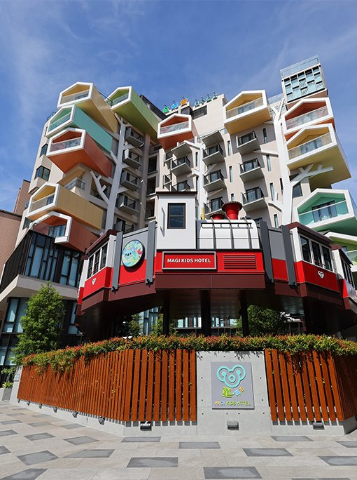 飯店外觀以火車與樹屋為設計主軸,宛如彩色積木堆疊起來好童趣!