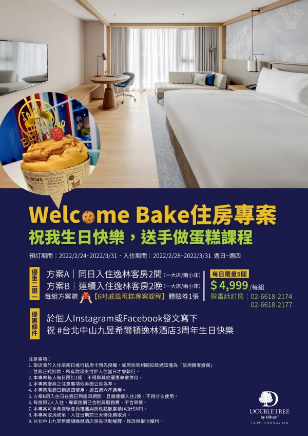 為了慶祝開業三周年,即日起至2022/3/31止,於個人Instagram或Facebook發文寫下「祝 #台北中山九昱希爾頓逸林酒店3周年生日快樂」,並透過電話預訂週日到週四限定的「Welcome Bake住房專案」,即可享每組優惠4999元入住寬敞逸林客房,並能彈性選擇同日入住逸林客房2間,或連續入住逸林客房2晚,每房限2人入住。每組訂房另贈6吋戚風蛋糕課程體驗券一張。