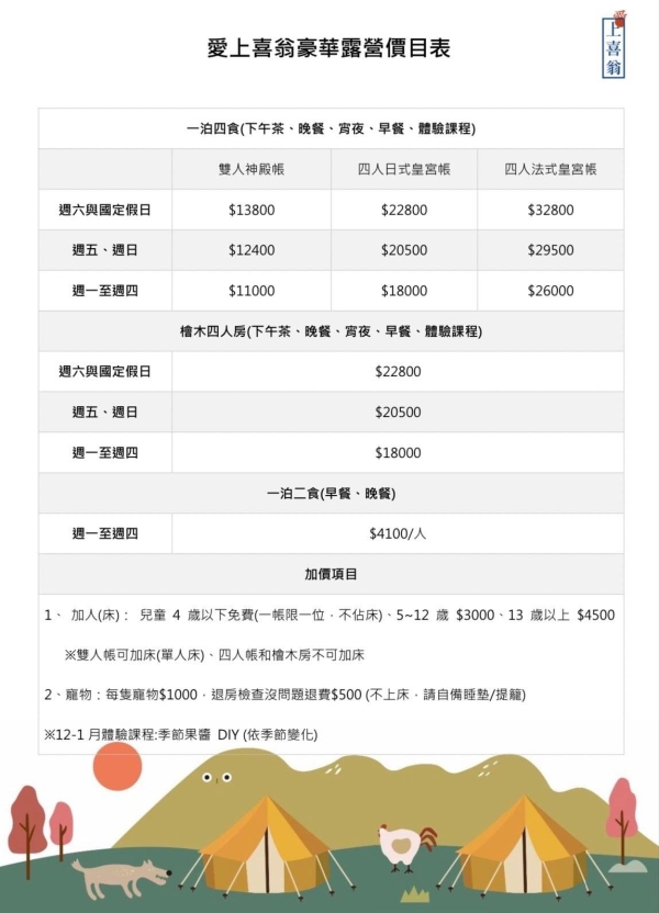 預計收費:一人5500元至7200元。相關資訊和公告可留意「愛上喜翁Glamping」FB粉專唷!