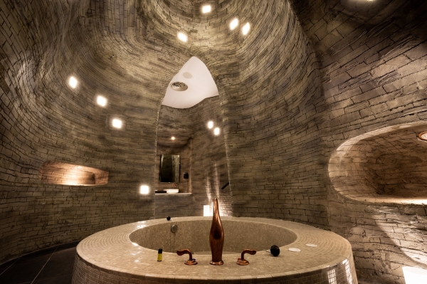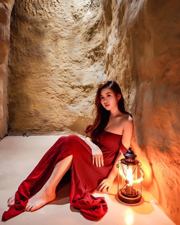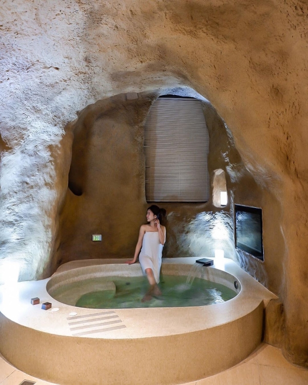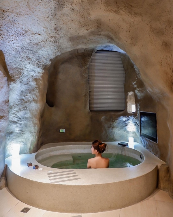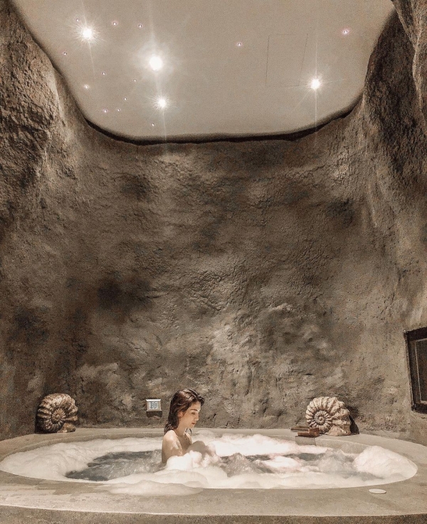 「山洞」浴缸裡面還有石階的設計可以坐著,絢爛的燈光+浪漫氛圍,還有舒適的按摩功能,很適合情侶一起前往~