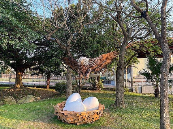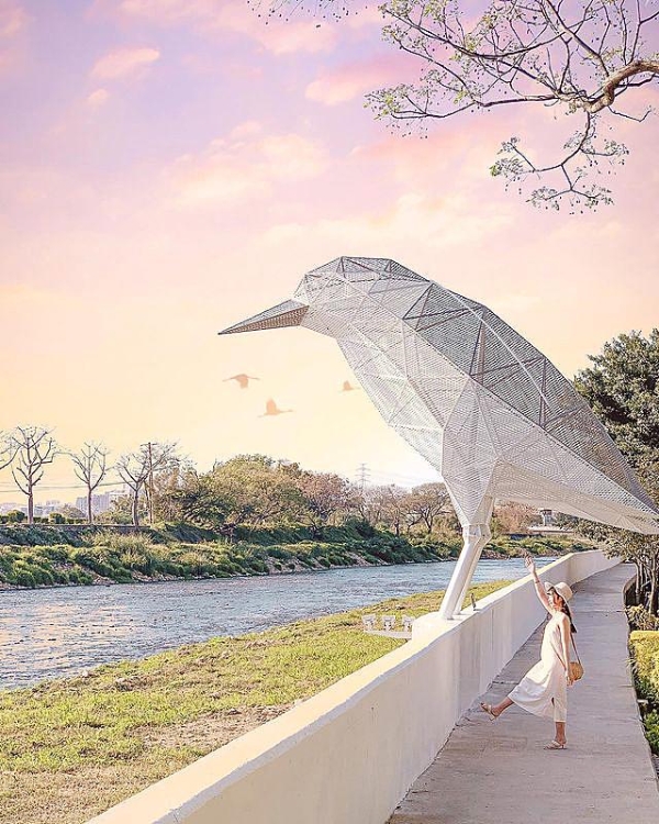 夜鷺是近年常見於南崁溪流域的鳥類族群,為水質淨化的指標生物。本作品之作者以「溪花潺潺、白影婆娑」為主題,為仿造夜鷺獨特的姿態與色彩特徵,佇立於河堤之上,賦予來訪的市民一起凝視前方經濟整治後脫胎換骨,以及彰顯人類與自然共生精神。