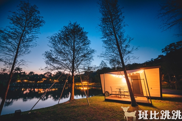 湖畔豪華露營車鄰近跳跳船活動空間、視野廣闊、湖景優美、樹林圍繞。
