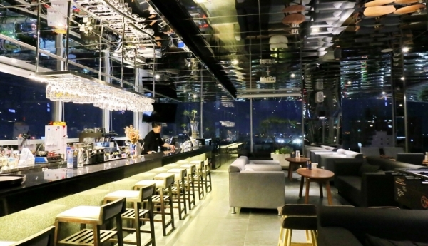 另外,飯店頂樓還有高空酒吧,不鏽鋼鏡面環繞配上舒適的原木家具,戶外水池中的白水木大型植栽,讓人宛如置身大自然中,愜意地坐在這邊欣賞嘉義市景,將璀璨的夜景盡收眼底!