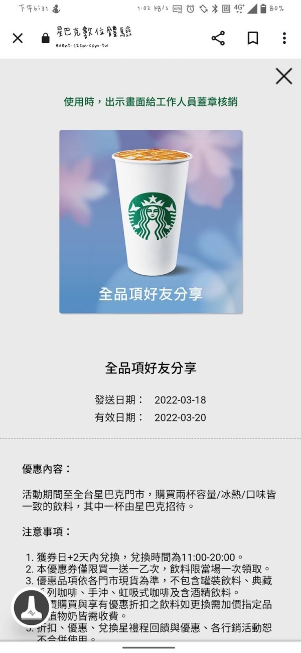 優惠券兌換期限為獲券日+2天內兌換(3/15開始抽,3/16開始兌換),兌換時間為11:00-20:00