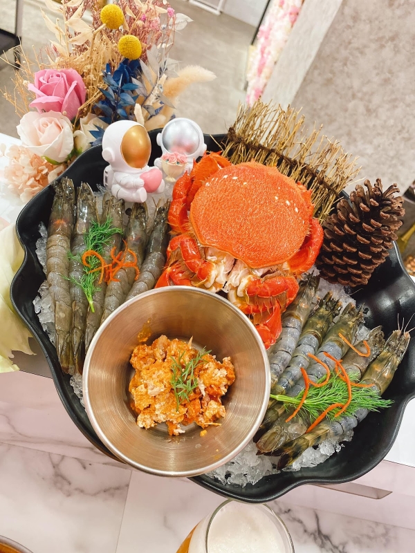 當然還有最重頭戲的甜品~咾鍋的「甜點皇后」完全不輸咖啡廳下午茶!托盤裡這些化妝品跟面霜通通都是可以吃的!唇膏是巧克力和草莓巧克力,面霜罐裡裝著香草和草莓起司冰淇淋,架上那杯是可以解膩的荔枝果醋,更重要的是,盤子裡放的美金是真鈔不是裝飾品喔!